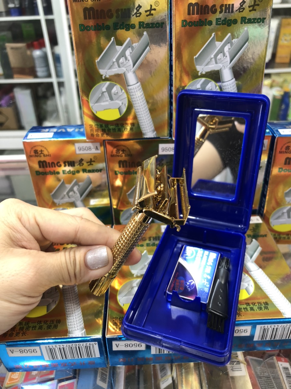 - bộ sản phẩm bao gồm: 01 dao cạo râu + 01 lưỡi dao lam + 01 hộp đựng có gương.