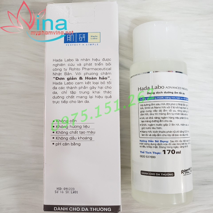 Dung Dịch Dưỡng Ẩm Tối Ưu Da Thường, Khô Hada Labo Advanced Nourish Hyaluron Lotion không cồn, không hương liệu, không chất tạo màu, không dầu khoáng, pH cân bằng.