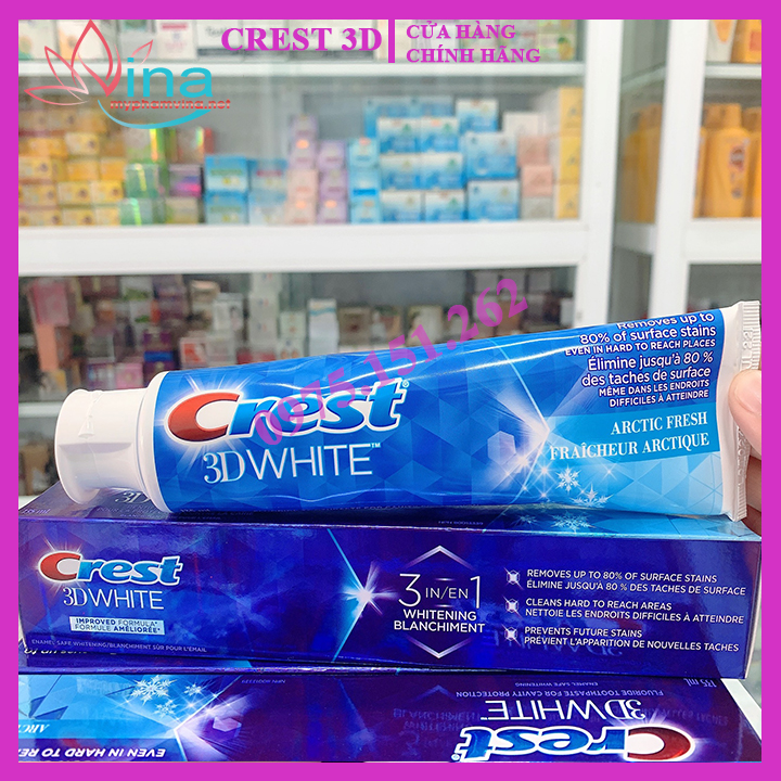 Làm trắng nụ cười của bạn với kem đánh răng Crest 3D White Arctic Fresh Whitening. Kem đánh răng Crest 3D White làm trắng răng của bạn bằng cách loại bỏ tới 80% vết bẩn trên bề mặt và bảo vệ chống lại các vết bẩn trong tương lai để có nụ cười trắng hơn.