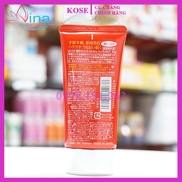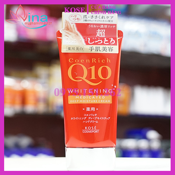 Kem dưỡng trắng da TAY, CHÂN Coen Rich Q10 (dành cho da khô) của Kose : Có chứa chất tái tạo da Q10 và chiết xuất ngọc trai. Đặc biệt hiệu quả cho da khô, da bị nứt nẻ. Giúp da mềm mại, chống nhăn, dưỡng trắng và làm chậm quá trình lão hoá.