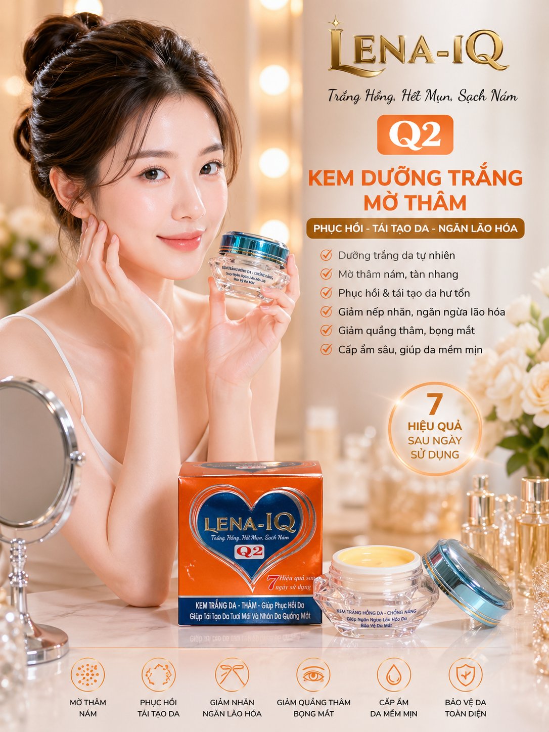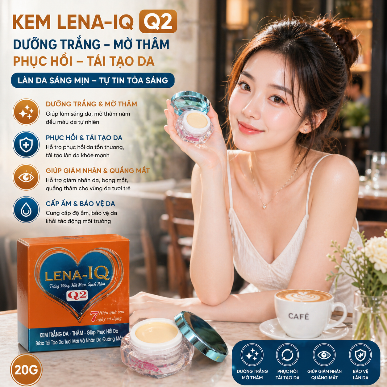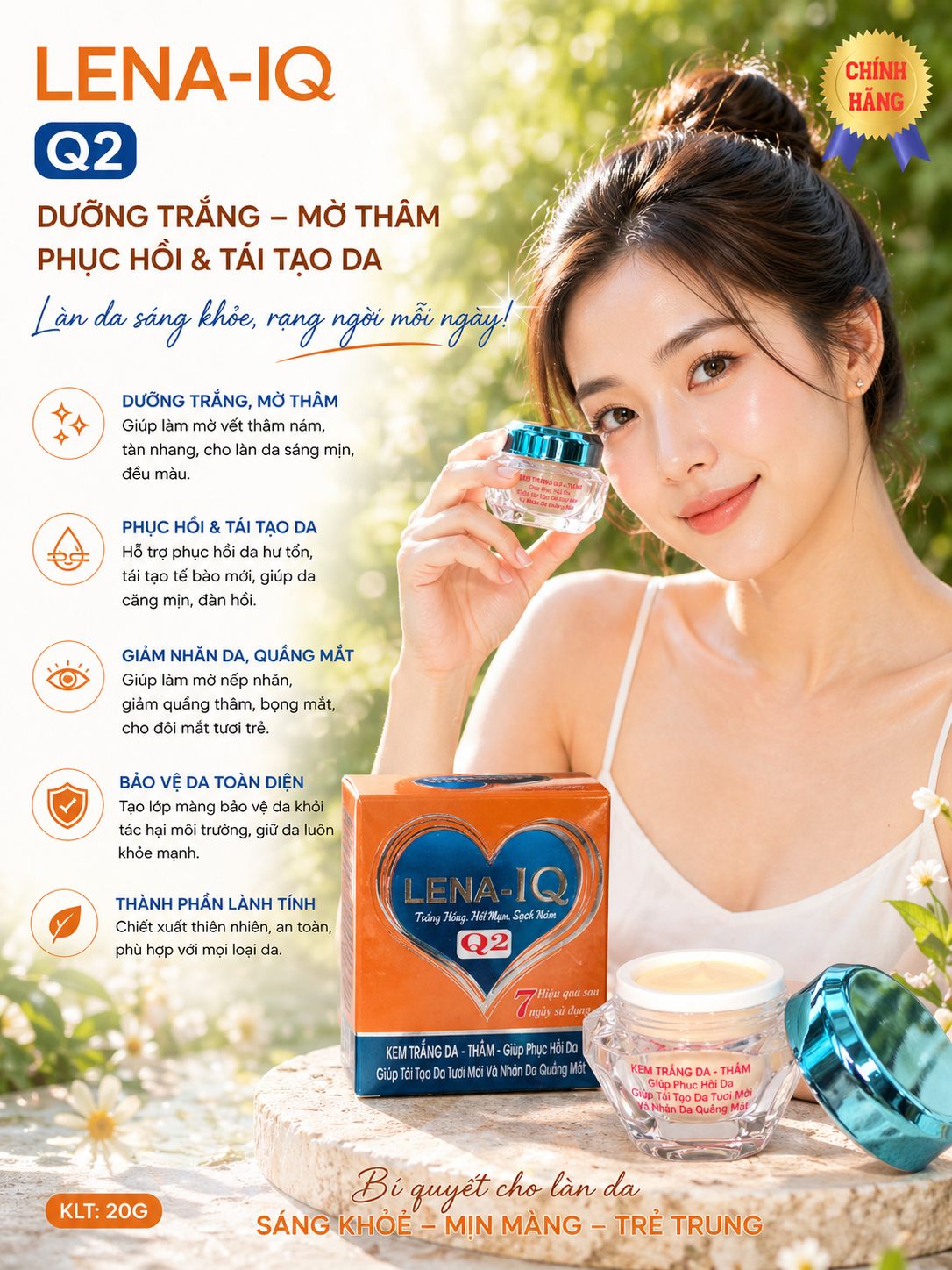 Kem LENA-IQ Q2 dưỡng trắng - Thâm - Giúp phục hồi - Tái tạo da - Nhăn da quầng mắt 20gr