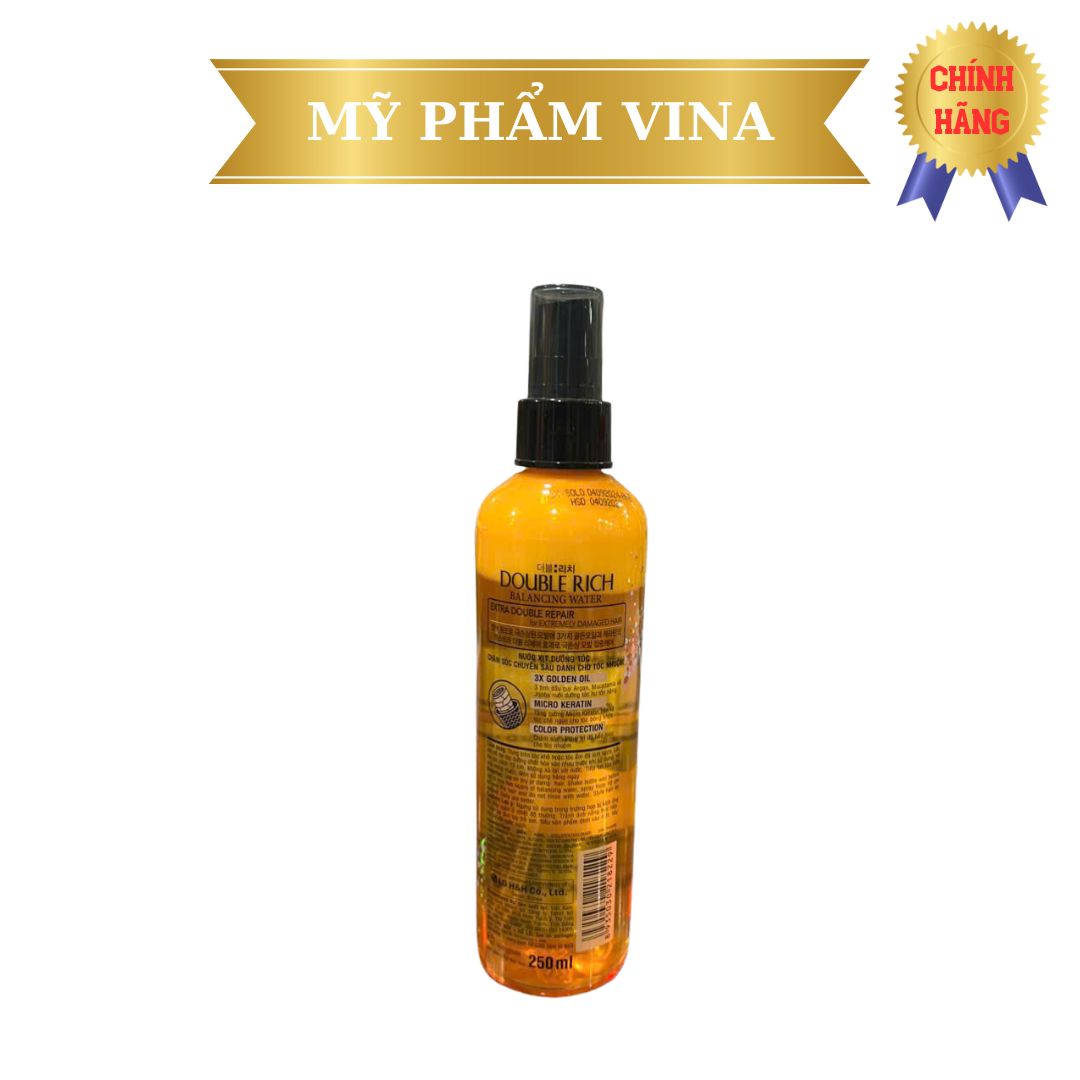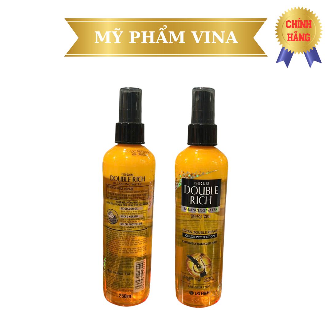 Nước Dưỡng Tóc Double Rich Balancing Water Extra Double Repair Color Protection với công thức mới cải tiến giúp chăm sóc tóc chuyên sâu dành cho mái tóc nhuộm / tóc hư tổn nặng do tác động của nhiệt độ cao hay hóa chất tạo kiểu. Sản phẩm giúp cung cấp độ ẩm và hàm lượng keratin thiết yếu để phục hồi hồi các hư tổn, mang lại mái tóc suôn mềm và óng mượt hơn, đồng thời hỗ trợ bảo vệ và duy trì màu tóc được bền đẹp lâu dài.