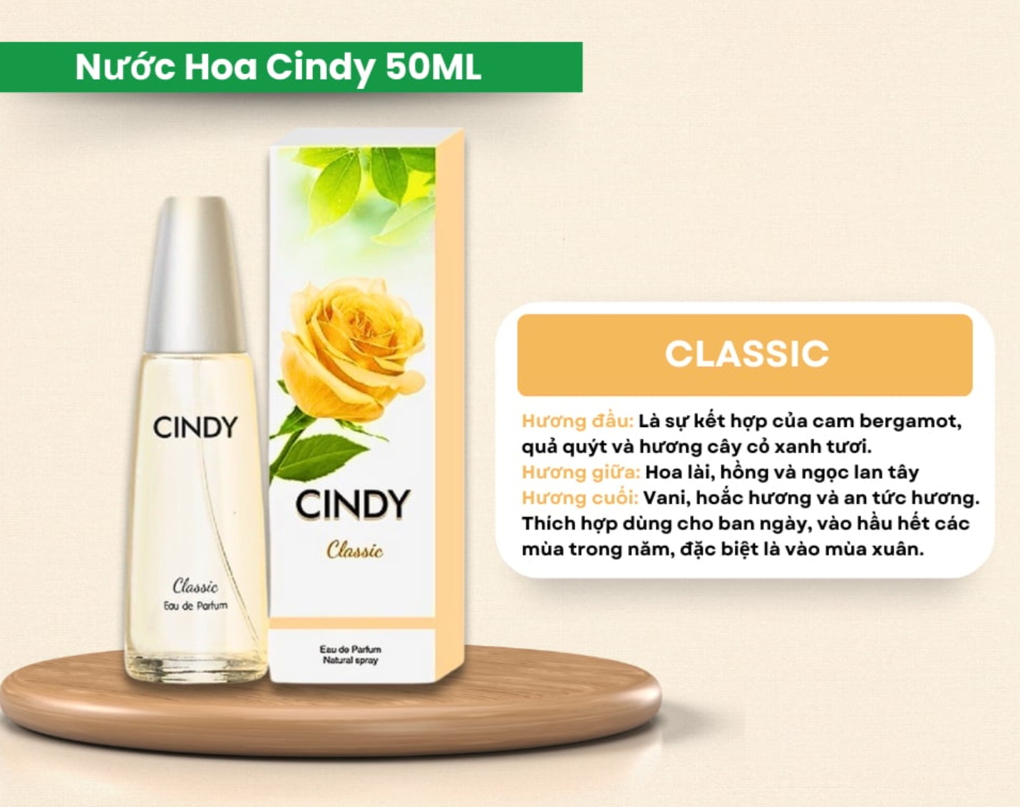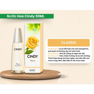 Nước hoa Cindy là sự lựa chọn tuyệt vời dành cho bạn. Nước hoa Cindy Classic N3 50ml giúp khử mùi, lưu lại hương thơm quyến rũ dài lâu cho bạn thêm tự tin tỏa sáng. Dạng nước hoa khử mùi với thành phần an toàn, phù hợp với mọi loại da nên bạn có thể yên tâm sử dụng.