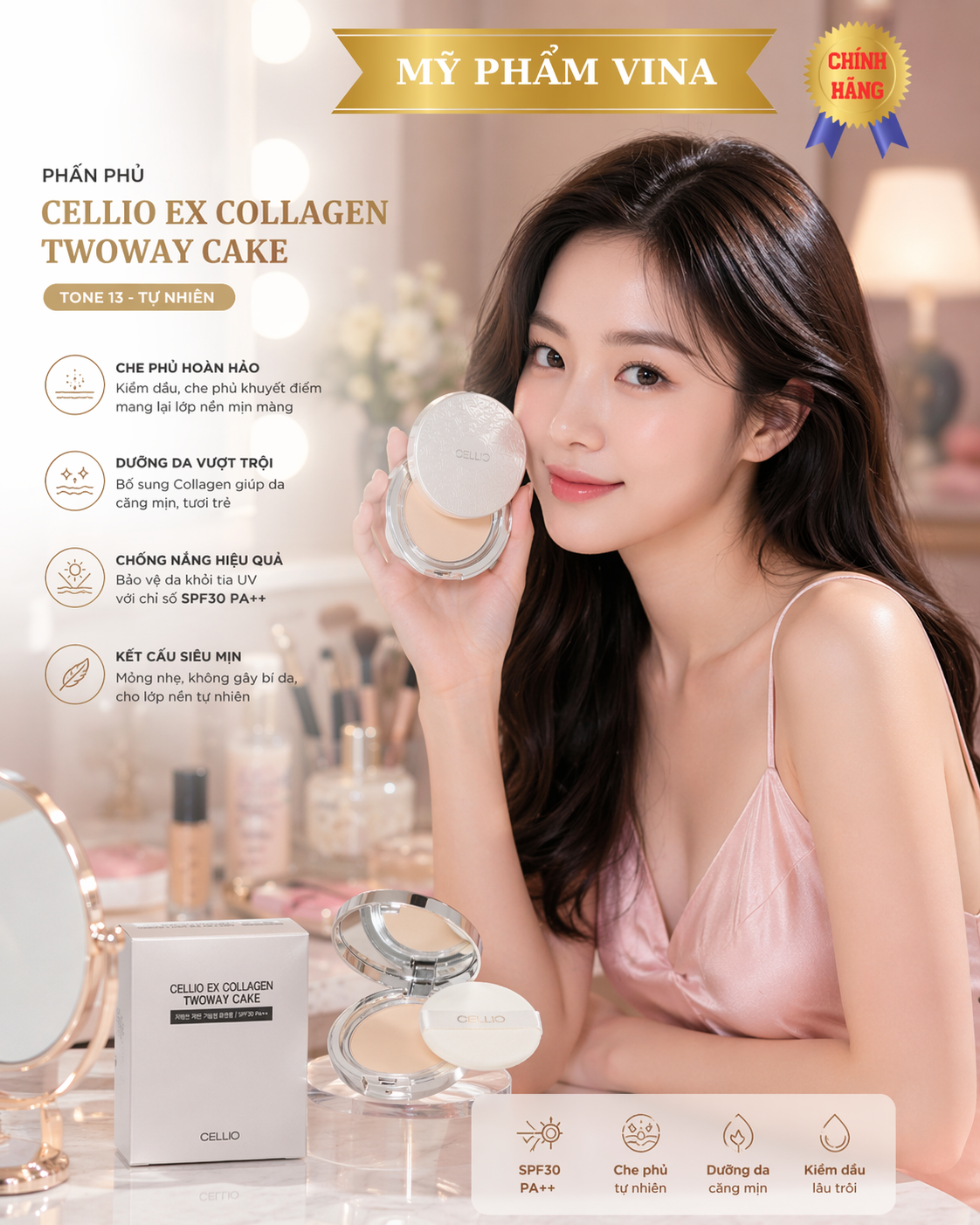 Sản phẩm phấn phủ Cellio có khả năng chống nắng (SPF 30, PA++), giúp da chống lại các tác động từ bên ngoài. Bảo vệ làn da bạn một cách tối ưu nhất.