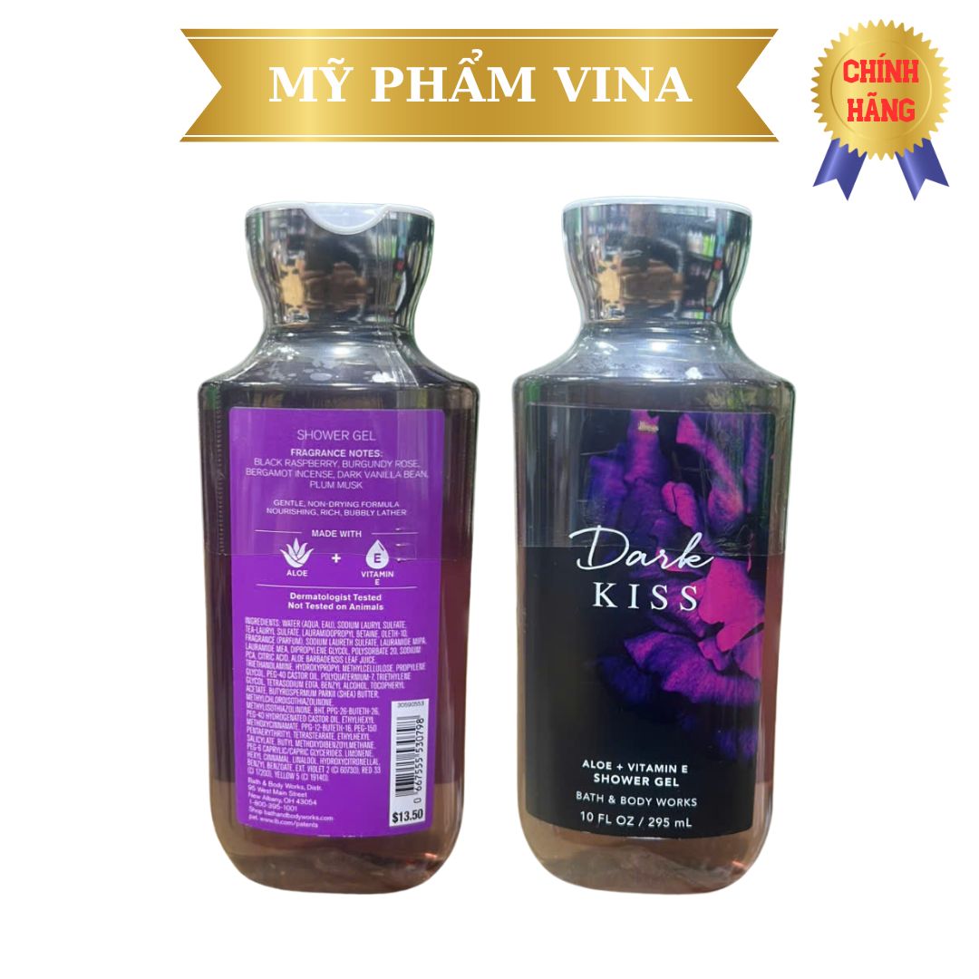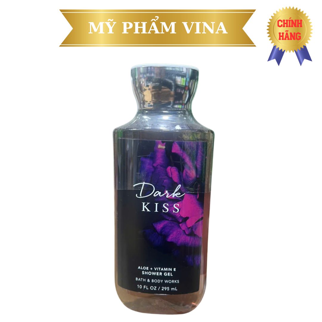Sữa tắm với công thức độc quyền của Bath & Body Works Dark Kiss là kết hợp của Bơ hạt mỡ (Shea Butter) , Vitamin E nuôi dưỡng làn da và cùng sự pha trộn quyến rũ giữa mật ngọt quả dâu rừng trong đêm tĩnh lặng với nụ hôn nồng ấm của vani để khơi dậy sự quyến rũ tiềm tàng trong cơ thể của người phụ nữ.