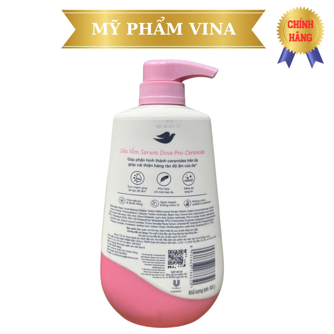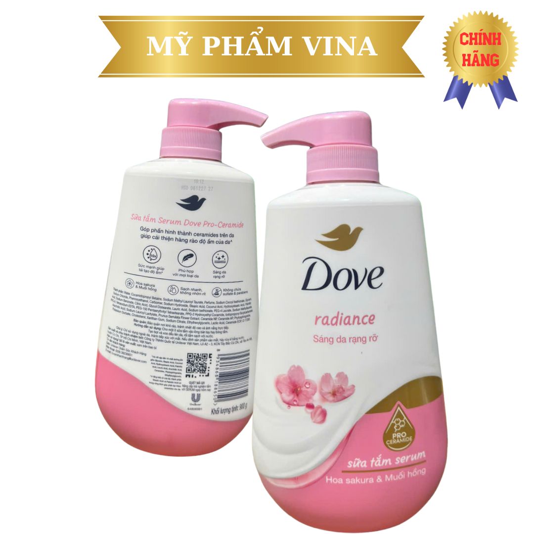 Sữa tắm Dove với chiết xuất hoa anh đào và muối hồng, sữa tắm serum Dove Pro-ceramide Radiance giúp da ẩm mịn, sáng rạng rỡ và lưu hương hoa anh đào ngọt ngào sau mỗi lần tắm
