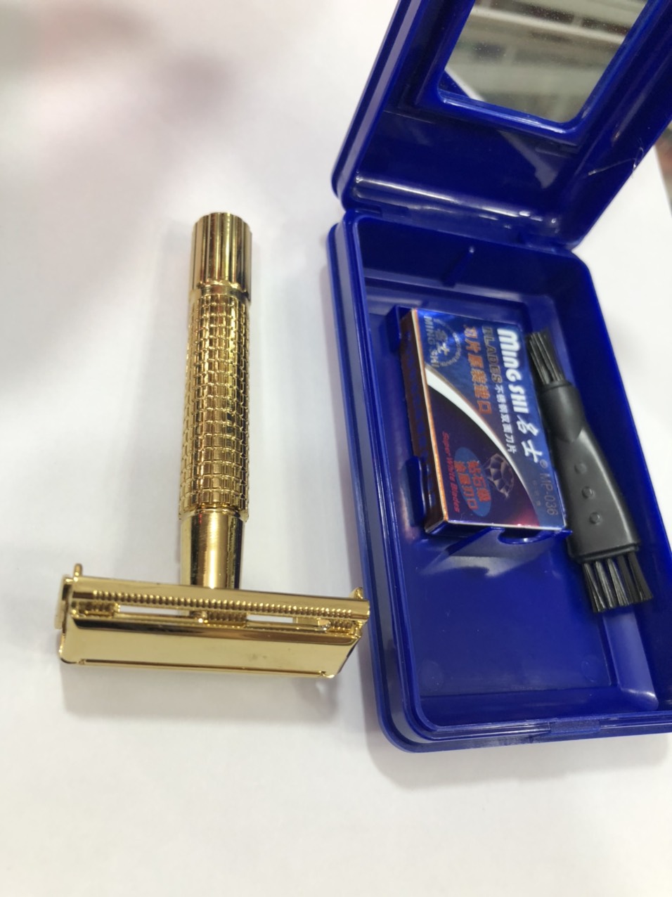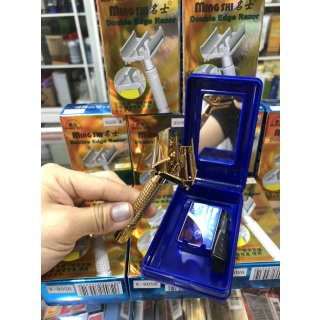 - bộ sản phẩm bao gồm: 01 dao cạo râu + 01 lưỡi dao lam + 01 hộp đựng có gương.