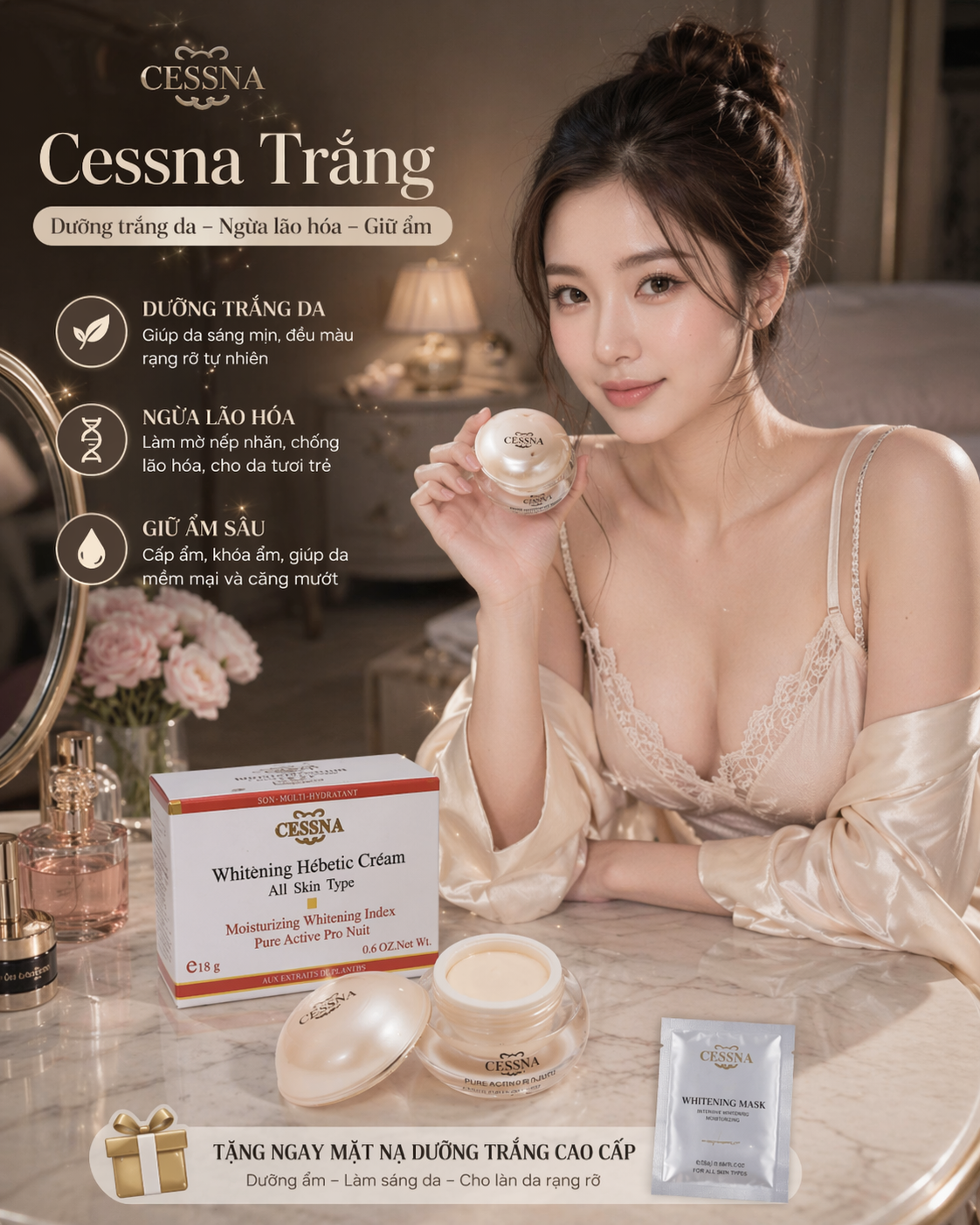 KEM CESSNA Dưỡng Trắng Da Giữ Ẩm Công dụng Kem Cessna dưỡng trắng da giữ ẩm: – Được chiết xuất từ các hoạt chất thảo dược, kem dưỡng trắng da Whitèning Hébetic Crém có khả năng tạo ra làn sóng da trắng sáng sau một thời gian sử dụng liên tục. Với kem dưỡng trắng da Whitèning Hébetic Crém đậm đặc, chỉ cần một lượng nhỏ là có thể sử dụng cho toàn bộ khuôn mặt. – Đây là loại kem dưỡng trắng da & dưỡng ẩm. Mang lại hiệu quả tức thời thì sau 7 ngày sử dụng và phù hợp cho các loại da, sản phẩm có nguồn gốc từ Pháp. Kem dưỡng trắng da Whitèning Hébetic Crém sẽ tạo ra một làn da trắng nhờ tác dụng làm mờ chất Melamin của làn da tàn nhang vàng.