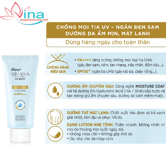 - Dưỡng thể mát lạnh: : Chiết xuất nha đam và trà xanh giải nhiệt và làm dịu da, phục hồi da hư tổn do nắng.