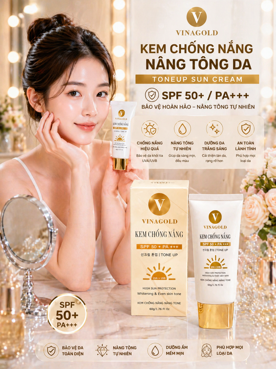 Chỉ số bảo vệ da cao (SPF - PA++++) giúp chống tia UVA, UVB ngừa da sạm nám. Cùng khả năng dưỡng sáng từ thành phần Niacinamide giúp cải thiện nếp nhăn và nâng tông màu da tức thì.