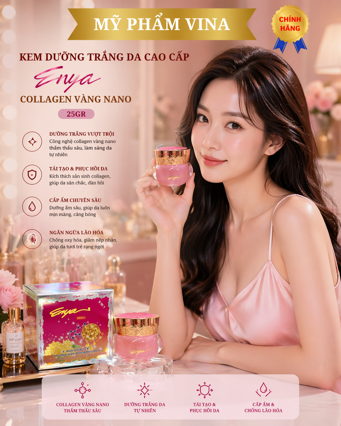 Kem dưỡng trắng da cao cấp enya collagen vàng nano 25gr là giải pháp hữu hiệu dùng cho da nhạy cảm, chiết xuất từ thiên thiên, tinh chất vàng nano, Enya Collagen vàng phát huy hết tính năng 9 tác dụng trong 1 sản phẩm dành riêng cho da mẫn cảm: