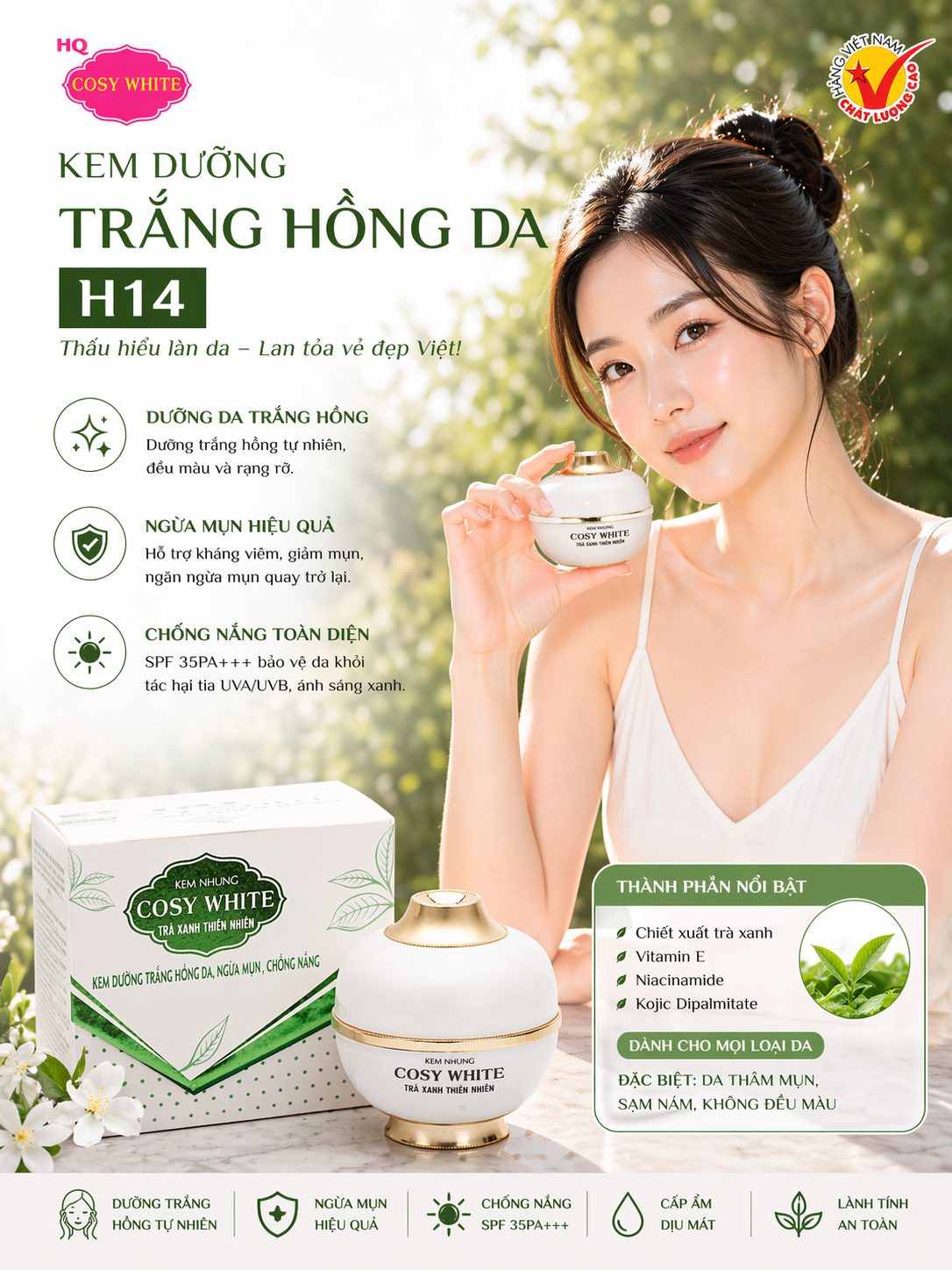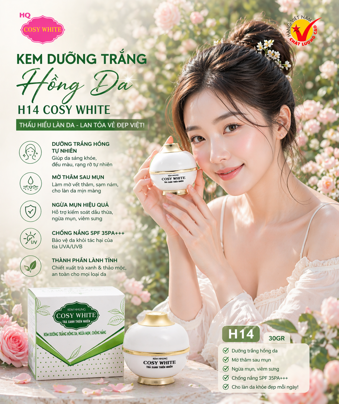 KEM HQ COSY WHITE H14 DƯỠNG TRẮNG HỒNG DA NGỪA MỤN CHỐNG NẮNG 30G