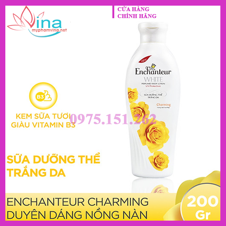 Sữa Dưỡng Thể Trắng Da Enchanteur Charming (200g) có thành phần giàu dưỡng chất từ kem sữa tươi và Vitamin B3 giúp da trắng sáng đồng thời bổ sung sữa dưỡng ẩm cho làn da mềm mịn và trắng sáng tự nhiên.