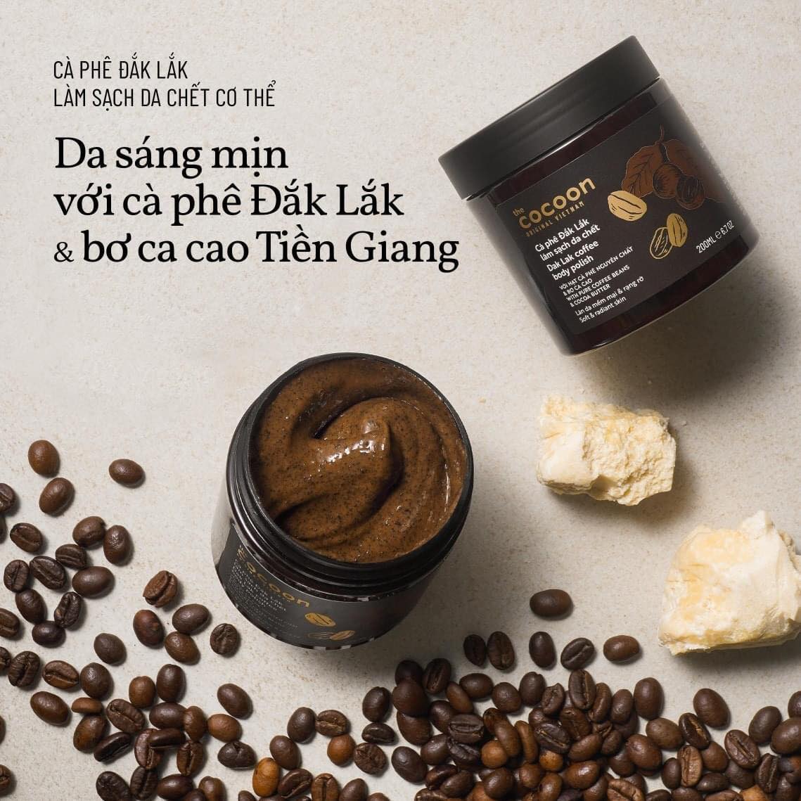 - Ngoài ra, trong tẩy tế bào chết body Cocoon còn bổ sung các thành phần dưỡng ẩm, ngừa khô da như bơ cacao, dầu dừa, Glycerin... Trong đó, bơ cacao chứa một lượng nhỏ vitamin E có tác dụng làm mềm, dưỡng ẩm, chống oxy hoá và vitamin K giảm mụn, đẩy nhanh quá trình phục hồi vết thương. Bơ cacao còn có tác dụng phòng ngừa rạn da và làm mờ các vết rạn da hiệu quả, thúc đẩy quá trình tái tạo da và giúp lưu thông máu tốt hơn.