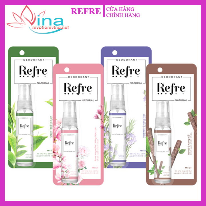 - Xịt Khử Mùi Refre Natural được chiết xuất từ thành phần thiên nhiên lành tính với 6 mùi hương: trà xanh, hương thảo, cúc la mã, ngọc lan tây, hồng mộc lan, hương gỗ có khả năng khử mùi hiệu quả cho bạn thêm phần tự tin thể hiện phong cách riêng của chính mình. Refre với kết cấu các hạt phấn siêu nhỏ, cực mịn sẽ giúp hút ẩm một cách nhanh chóng đồng thời hỗ trợ se nhỏ lỗ chân lông, giữ cho vùng da dưới cánh tay bạn luôn khô thoáng, sáng mịn suốt cả ngày dài.